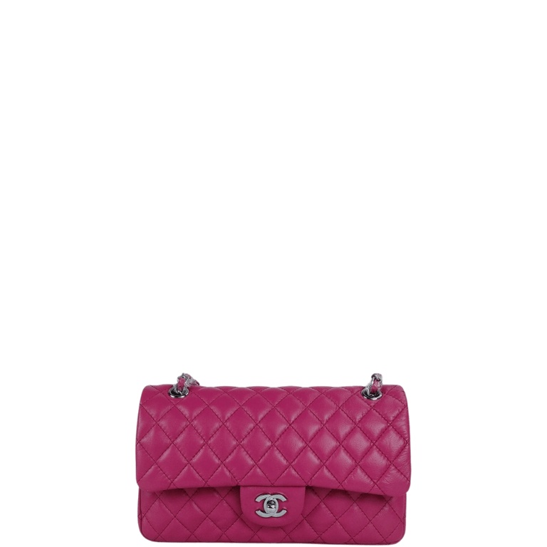 CHANEL CLASSIC MEDIUM LAMBSKIN FLAP PINK AND SILVER 25CM