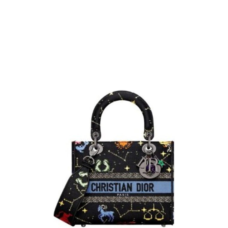 DIOR MEDIUM LADY D-LITE BAG BLACK MULTICOLOR DIOR PIXEL ZODIAC EMBROIDERY 24CM