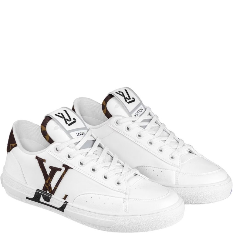 - The eco-designed Charlie Trainers, crafted from 90% sustainable materials, are revisited in an all-white version accented with Monogram signatures. These include Monogram textile trims made with recycled polyester on the backs and embroidered LV Initials logo on the sides. The outsoles, made from recycled rubber, feature the Louis Vuitton signature
