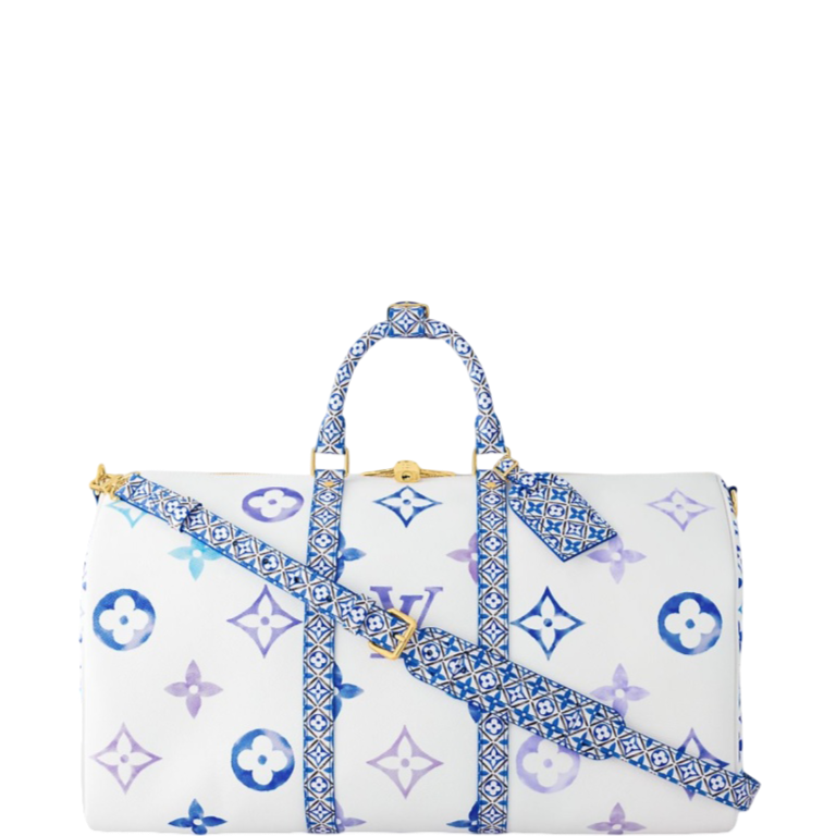 This Keepall Bandoulière 45 bag is made from canvas with a Giant Monogram pattern. The LVs and Monogram Flowers are in nuances of blue on a cream background. The side bands, top handles, and ends of the bag all feature a dense motif of Monogram Blossoms in the same blue colorway, inspired by Portuguese azulejo ceramic tiles.