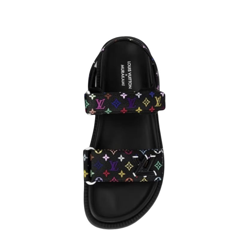 Striking signatures from the re-edition of the Louis Vuitton x Murakami collection reimagine the LV Sunset flat comfort sandal as a playful everyday statement. Crafted from coated canvas, the iconic Monogram motif is accented with bright rainbow tones inspired by the exuberant aesthetic of Japanese artist Takashi Murakami, while the front strap is embellished with chunky LV Initials with golden touches. Complete with an anatomic footbed and lightweight micro outsole for elevated comfort.