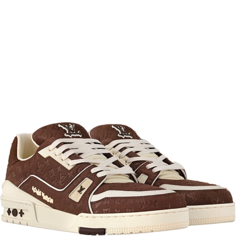 - Part of a collaboration with Tyler, this edition of the LV Trainer sneaker comes in nubuck embossed with Tyler’s reinterpretation of the Monogram pattern. He has also playfully revisited the Louis Vuitton signature, which is emblazoned on the side. This model’s color palette highlights its elaborately constructed upper, which takes seven hours to stitch.