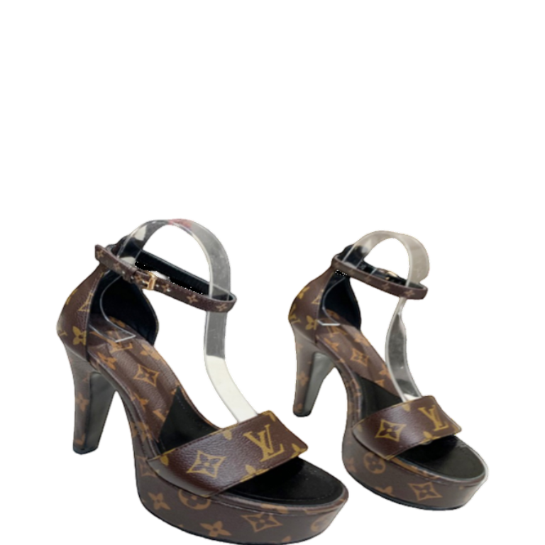 - The Afterglow platform sandal combines smooth with Louis Vuitton’s iconic Monogram canvas. The front strap, ankle strap, with Monogram canvas on the back and heel. A detail where the and canvas meet adds a refined, feminine touch.