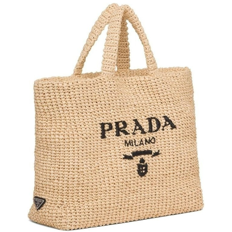 This tote bag with a soft, deconstructed design is made of raffia, a material of natural origin imbued with a summery mood. A maxi version of Prada’s iconic lettering logo embroidered on the front enhances the accessory.